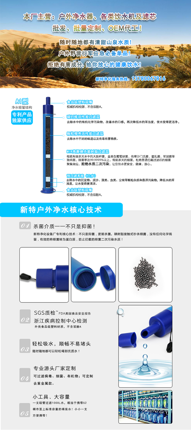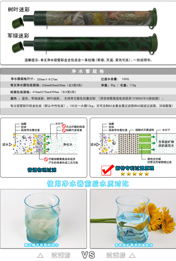 B1型微型野外生存凈水吸管采用碳纖維活性炭過濾層+顆粒椰殼活性炭過濾層+高聚碘殺菌樹脂過濾層結(jié)構(gòu),規(guī)格尺寸180×Φ33mm,使用壽命800L,重量凈重55g毛重70g,包裝規(guī)格21X5X3.5cm,顏色為天藍(lán)色,軍綠迷彩,樹葉迷彩,沙漠迷彩等多種可選.