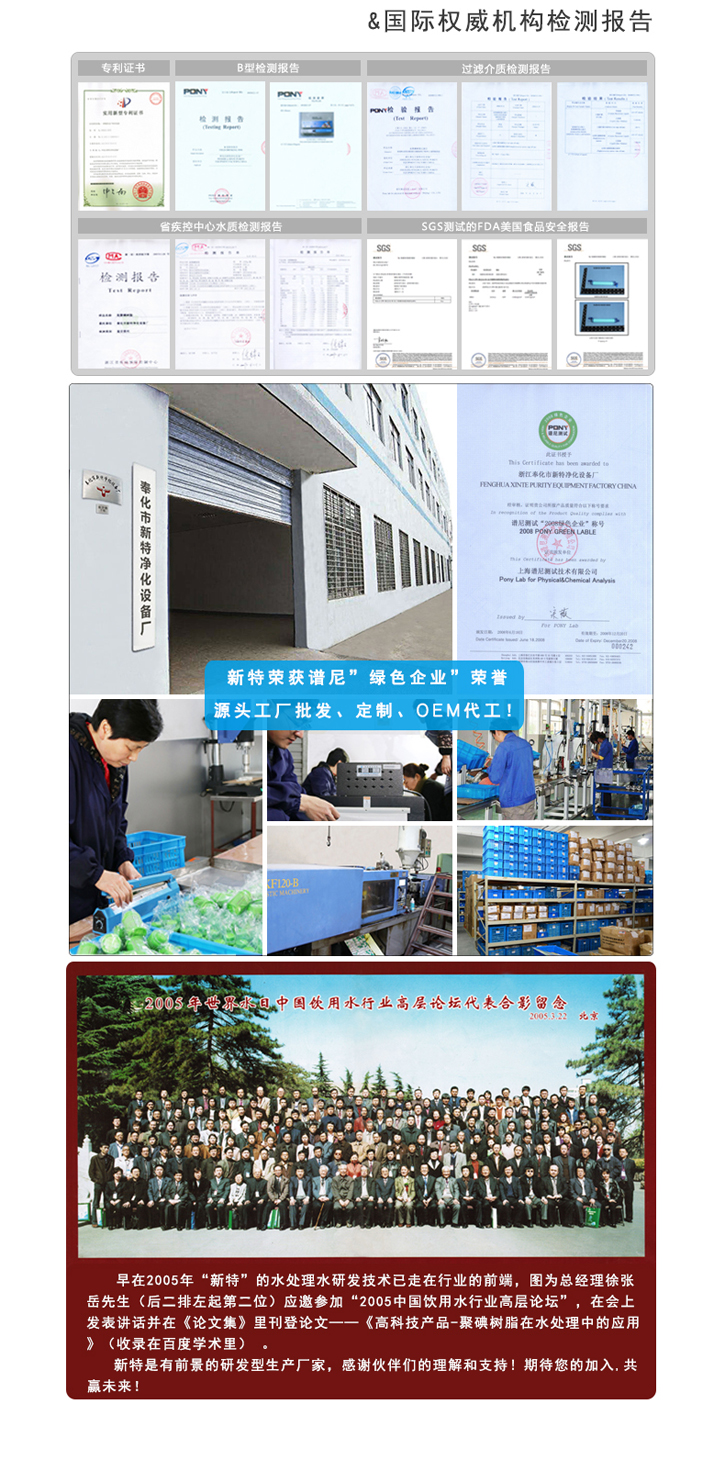 用高聚碘樹脂殺菌,殺病毒,作為第一道殺菌過濾。有效殺滅水中的大腸桿菌、金黃色葡萄球菌、傷寒沙門氏菌、霍亂菌、軍團(tuán)菌等致病菌,能有效預(yù)防阿米巴痢疾及相關(guān)腸道疾病感染.有效阻止純超濾膜過濾的通病——攔截細(xì)菌的聚集效應(yīng),超濾膜無法攔截的聚集細(xì)菌所產(chǎn)生的二次毒素,及病毒等。