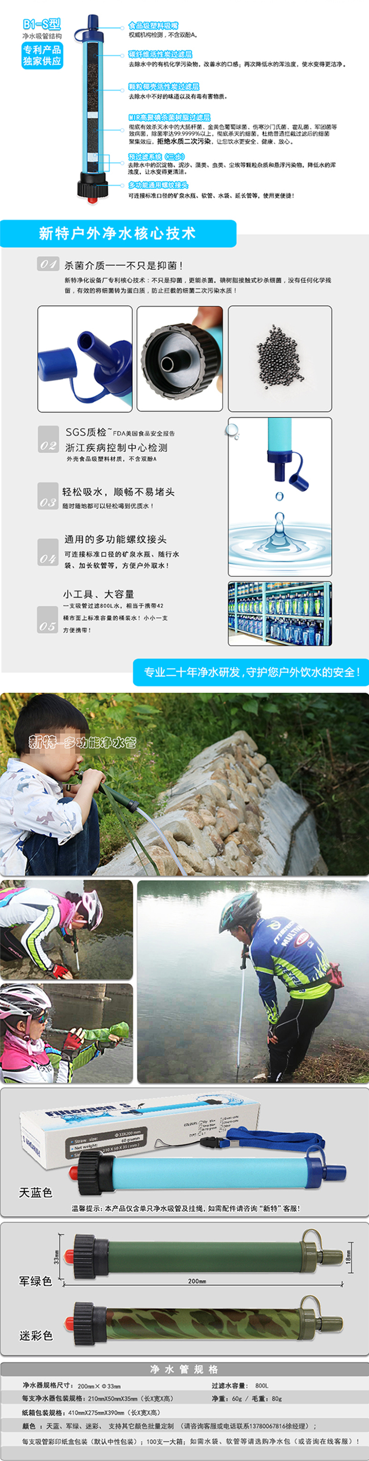 B1型微型野外生存凈水吸管采用碳纖維活性炭過濾層+顆粒椰殼活性炭過濾層+高聚碘殺菌樹脂過濾層結(jié)構(gòu),規(guī)格尺寸180×Φ33mm,使用壽命800L,重量凈重55g毛重70g,包裝規(guī)格21X5X3.5cm,顏色為天藍(lán)色,軍綠迷彩,樹葉迷彩,沙漠迷彩等多種可選.