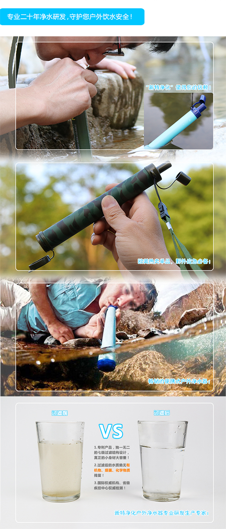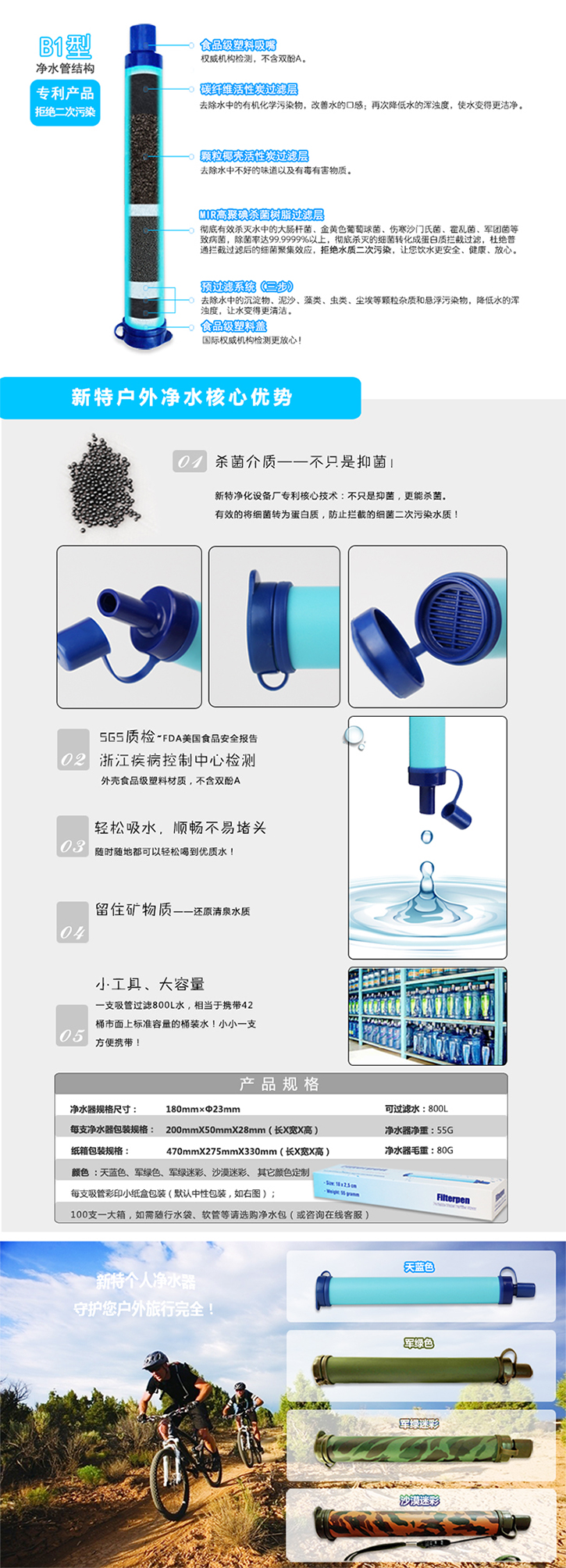 B3型戶外個人生存凈水器采用高聚碘殺菌樹脂過濾層+顆粒椰殼活性炭過濾層+碳纖維活性炭過濾層+高精度親水超濾膜結構,規格尺寸180×Φ23mm,重量凈重55g毛總70g,顏色為天藍色,深藍色,軍綠色等多種可選,使用壽命2000L.