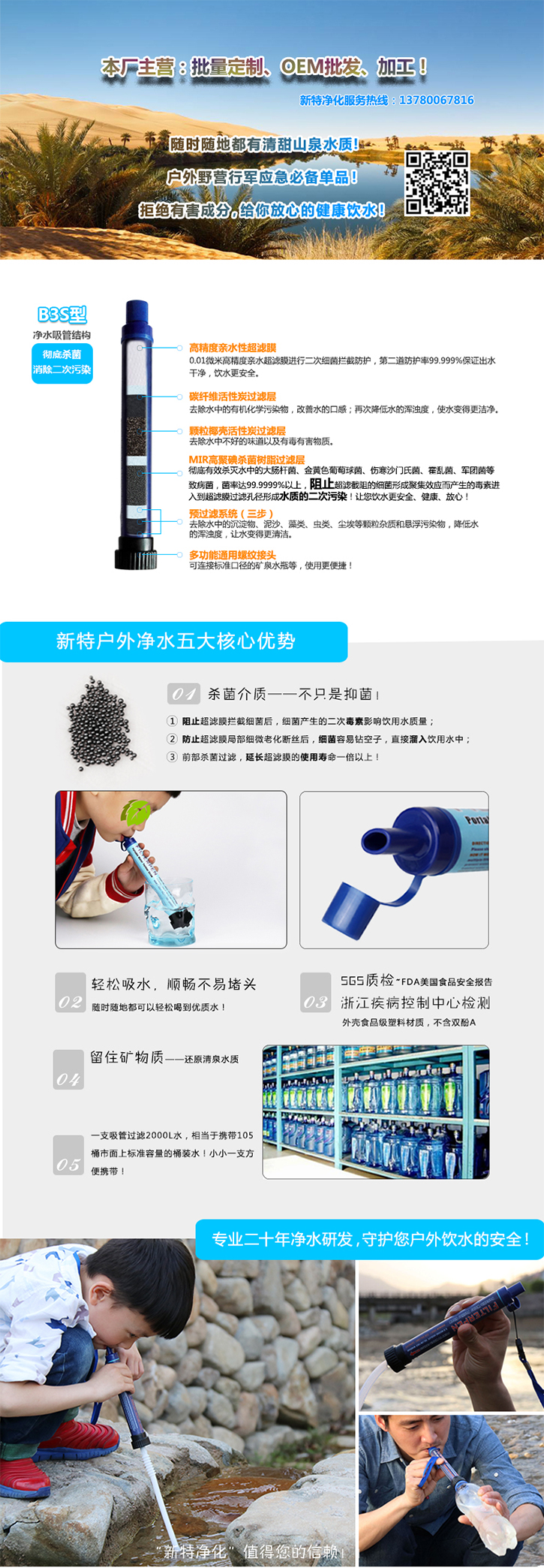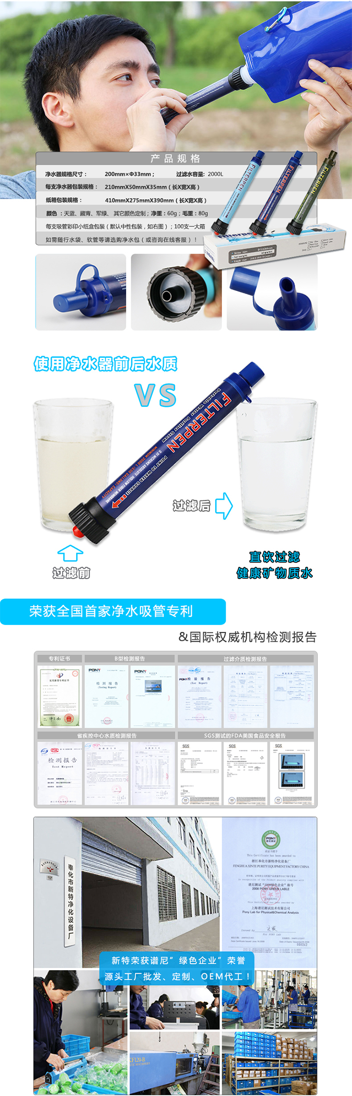 B3型戶外個人生存凈水器采用高聚碘殺菌樹脂過濾層+顆粒椰殼活性炭過濾層+碳纖維活性炭過濾層+高精度親水超濾膜結構,規格尺寸180×Φ23mm,重量凈重55g毛總70g,顏色為天藍色,深藍色,軍綠色等多種可選,使用壽命2000L.